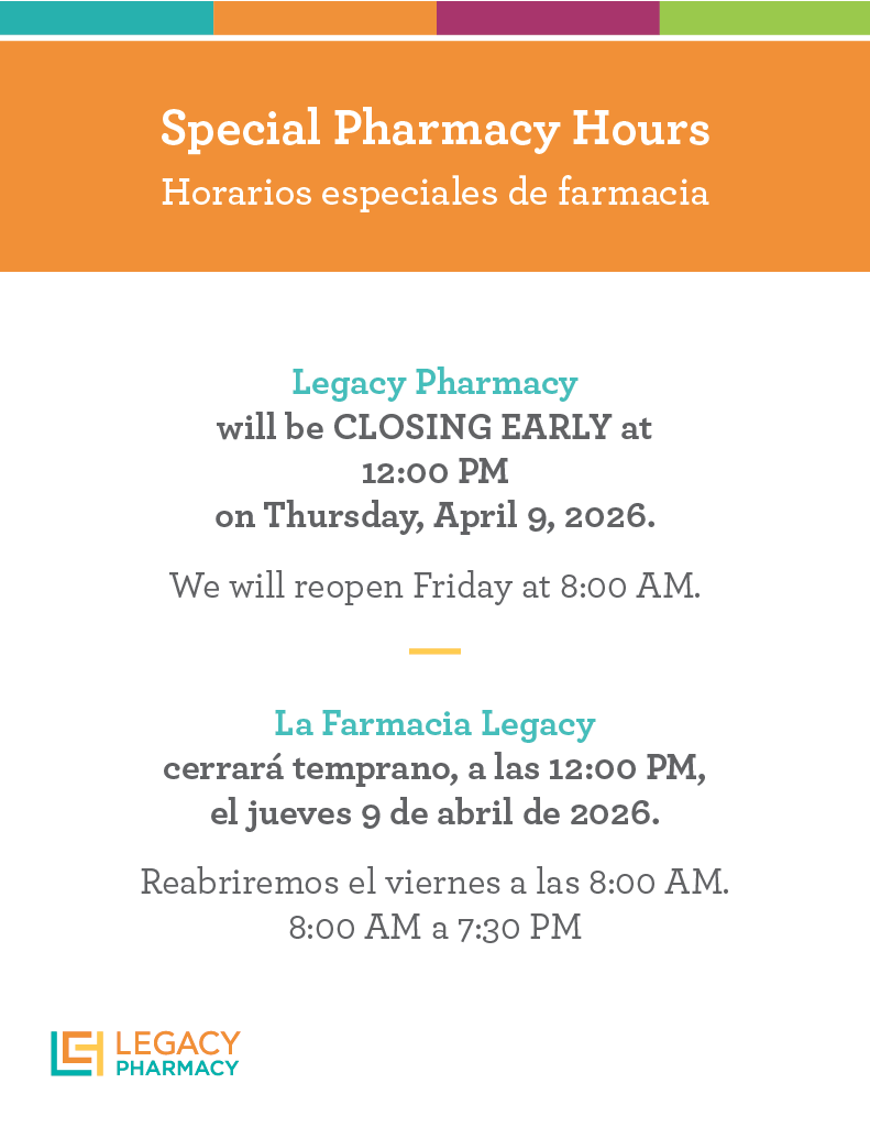 Las clÃnicas de Legacy Community Health, las Farmacias Legacy y Wellness Bar by Legacy estarán cerradas el miércoles 24 de diciembre, jueves 25 de diciembre y jueves 1 de enero por las fiestas. Regresaremos a nuestro horario normal el viernes 26 de diciembre y el viernes 2 de enero.