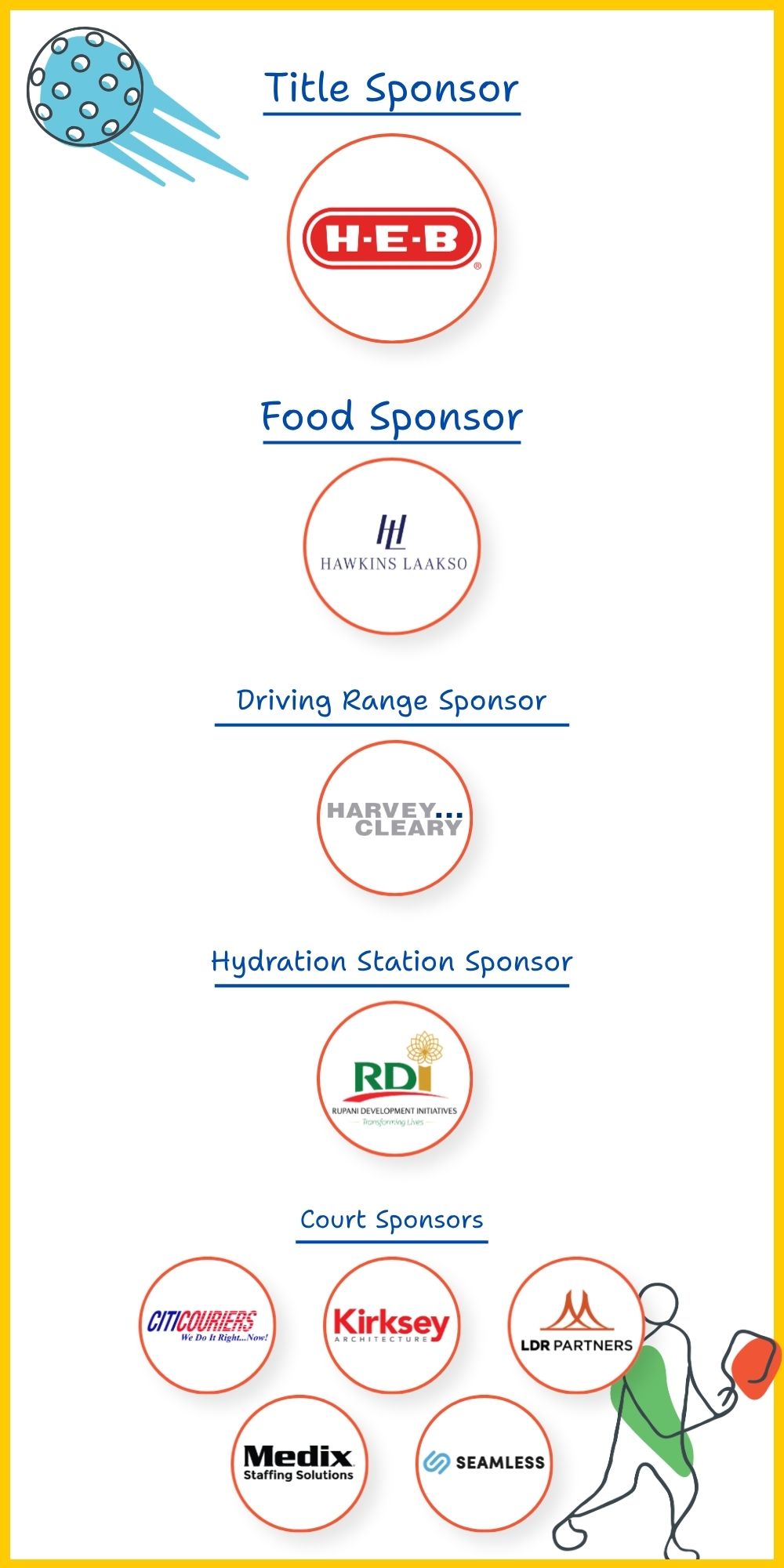 We welcome players of all skill levels, from beginners to experienced competitors. Each team is guaranteed multiple matches, with top teams advancing to the single-elimination finals. Take a break between games to explore our educational resource fair or warm up on the golf driving range. There is something for everyone on and off the court.