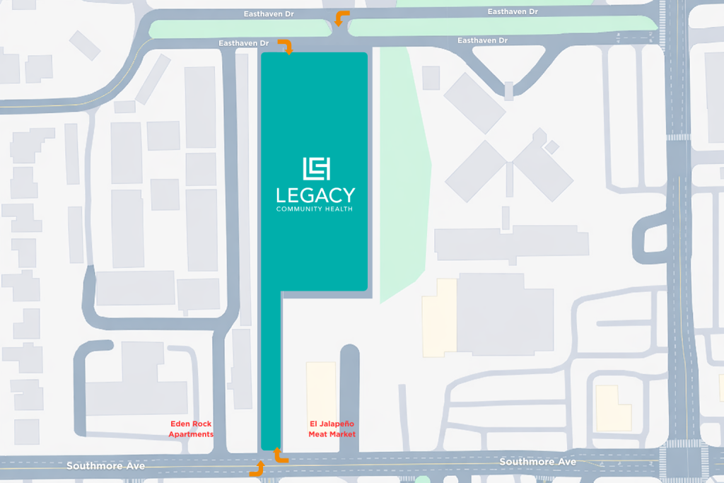Directions and Parking: The Legacy Community Health – Pasadena clinic and parking lot can be accessed from the Southmore Ave. entrance between the apartments and meat market, or from Easthaven Dr.
